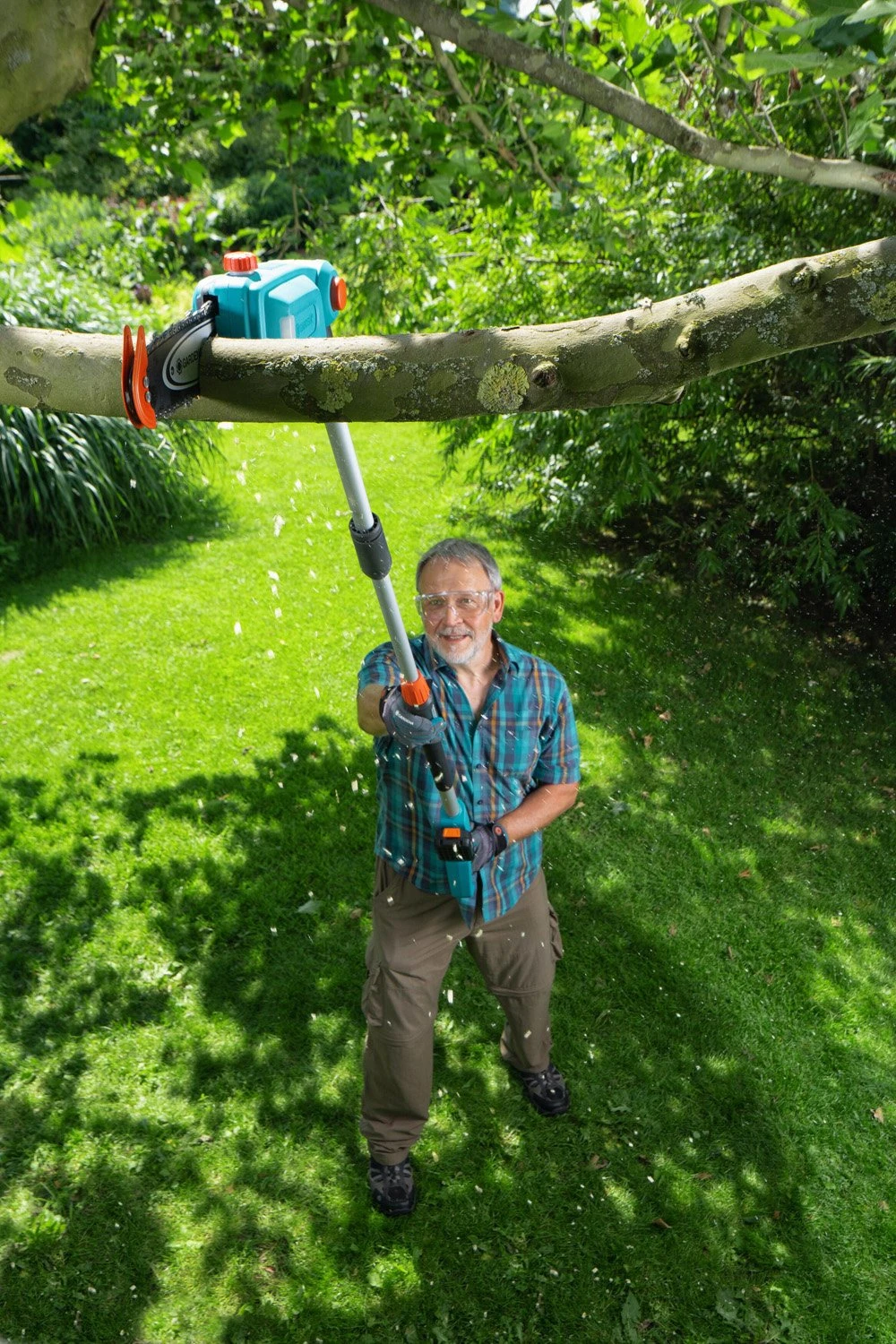 De GARDENA accu-telescopische snoeischaar TCS 20 / 18V P4A is handig, compact en snoeit nauwkeurig. Met een bladlengte van 20 centimeter en uitschuifbare telescoopsteel bereikt u takken tot wel vier meter hoog – zonder te moeten klimmen of jezelf in gevaar te brengen op een zwaaiende ladder. Doordat de telescoopzaag slechts 3,5 kilogram weegt, is er gemakkelijk mee te werken.